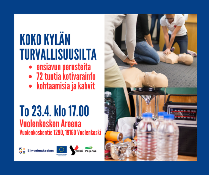 Illassa kannustetaan kyläläisiä ottamaan pieniä, mutta merkityksellisiä askeleita kohti turvallisempaa arkea. Illan aikana opitaan keskeisiä ensiaputaitoja, jotka lisäävät valmiuksia auttaa omaa perhettä, naapureita ja koko kyläyhteisöä. Lisäksi osallistujat saavat ajantasaista tietoa 72 tuntia -varautumisesta. Kahvitarjoilu.