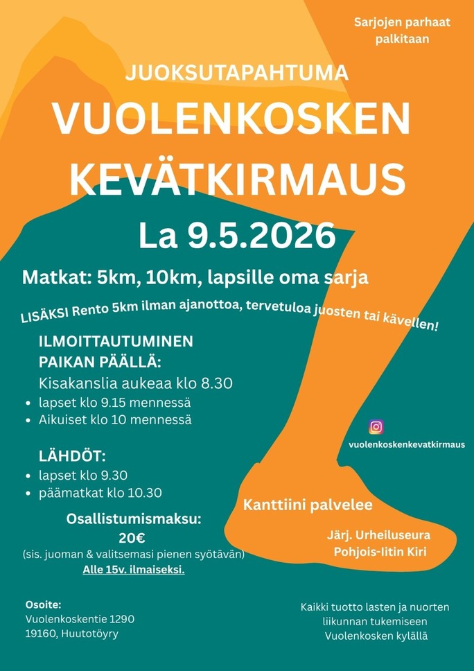Nyt on aika kaivaa lenkkarit esiin ja suunnata kohti valoisaa Vuolenkoskea lauantaina 9.5. - Rento juoksutapahtuma Kevätkirmaus kutsuu mukaansa upeisiin maalaismaisemiin juuri sinut!